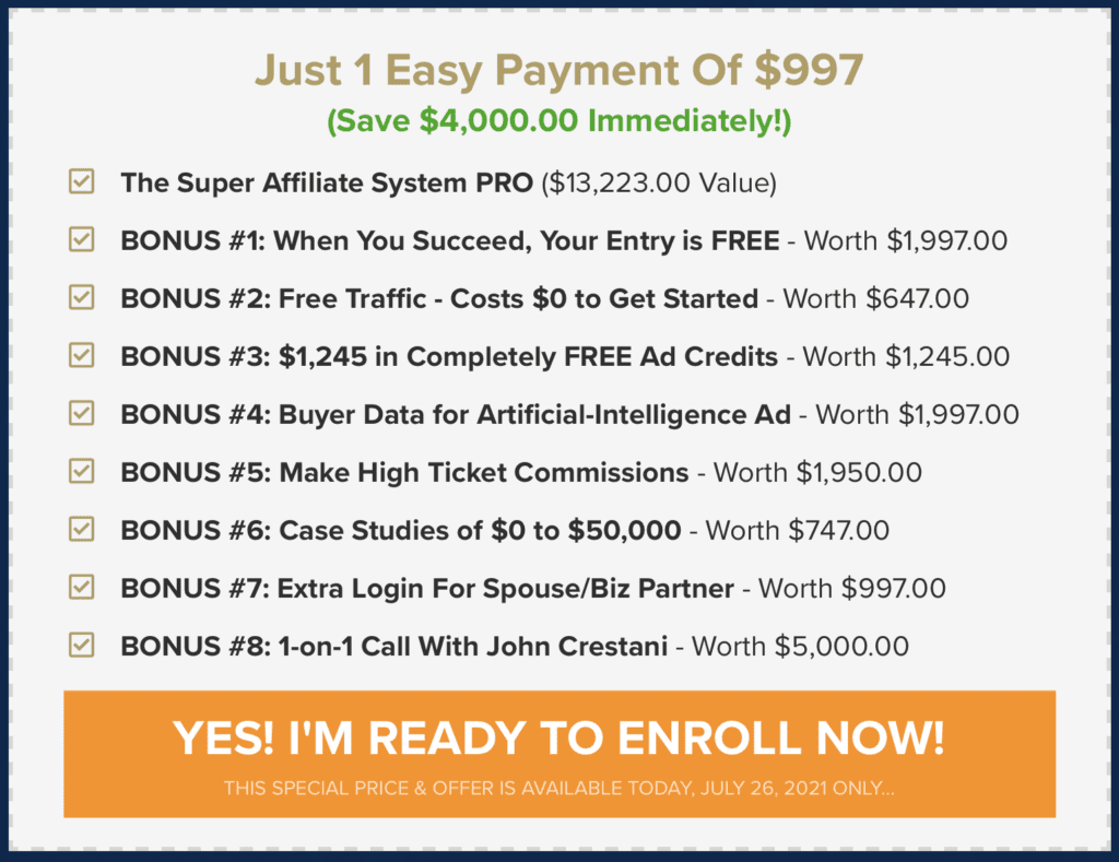 Highlighted below is another perfect example from a review I did on John Crestani’s Super Affiliate System Pro. This is the overvalued price point red flag in action.